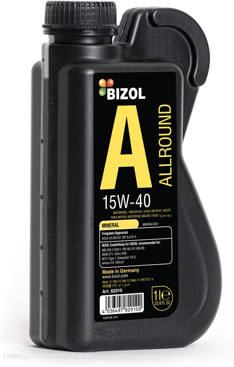 Olej silnikowy Bizol 15W-40 1L A3/B3 CF-4BIZOL Allround 15W-40 to nowoczesny wysokowydajny mineralny olej silnikowy do całorocznego stosowania w silnikach benzynowych i wysokoprężnych, w tym w silnikach z turbosprężarką i katalizatorem. Dzięki połączeniu zaawansowanych dodatków najnowszej generacji zapewnia doskonałą ochronę przed utlenianiem, zużyciem, lepszą ochronę przed pienieniem oraz posiada właściwości antykorozyjne i oczyszczające.Specyfikacja:API SJ/CF-4MB 228.1/229.1 | VW 501 01/505 00 | MAN M 3275 | Volvo VDS | MTU Type 2 | Caterpillar TO-2/ECF-1A | Allison C4 | MACK EO-M Plus | Cummins CES 20077 | Valtra E | New Holland NH 330G