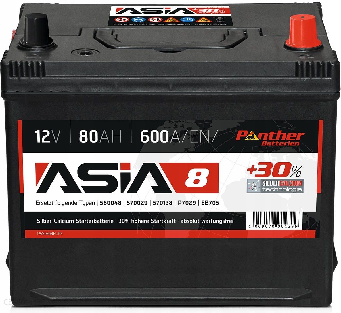 Panther ASIA – większa moc, większe bezpieczeństwo.Aby sprostać coraz większym zapotrzebowaniom na energie w nowych pojazdach z rynku azjatyckiego powstała linia akumulatorów ASIA o 30% większych parametrach w porównaniu do podobnych modeli w innych markach. Akumulatory te wytwarzane są w technologii srebrowo – wapniowej dzięki czemu charakteryzują się zwiększonym prądem, pojemnością oraz żywotnością.30% większy prąd rozruchowy oraz pojemnośćPełna bezobsługowośćTechnologia Silver / CalciumWbudowana kontrolka do optycznego sprawdzania stanu naładowaniaPrzystosowane do ładowania napięciem do 14.8 VoltWbudowany uchwytSPECYFIKACJA TECHNICZNANapięcie: 12 VoltPojemność: 80 AhPrąd Rozruchowy: 600 ADługość: 263 mmSzerokość: 175 mmWysokość: 225 mmBiegun +: Prawy